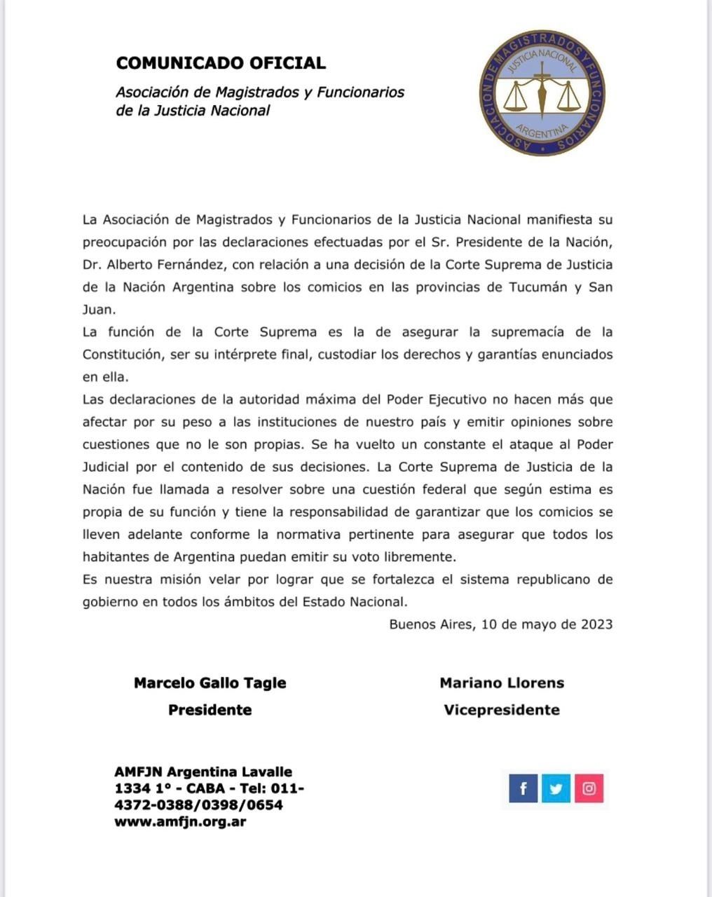 “La función de la Corte Suprema es la de asegurar la supremacía de la Constitución, ser su intérprete final, custodiar los derechos y garantías enunciados en ella”, respondió la Asociación de Magistrados a través de un comunicado.
