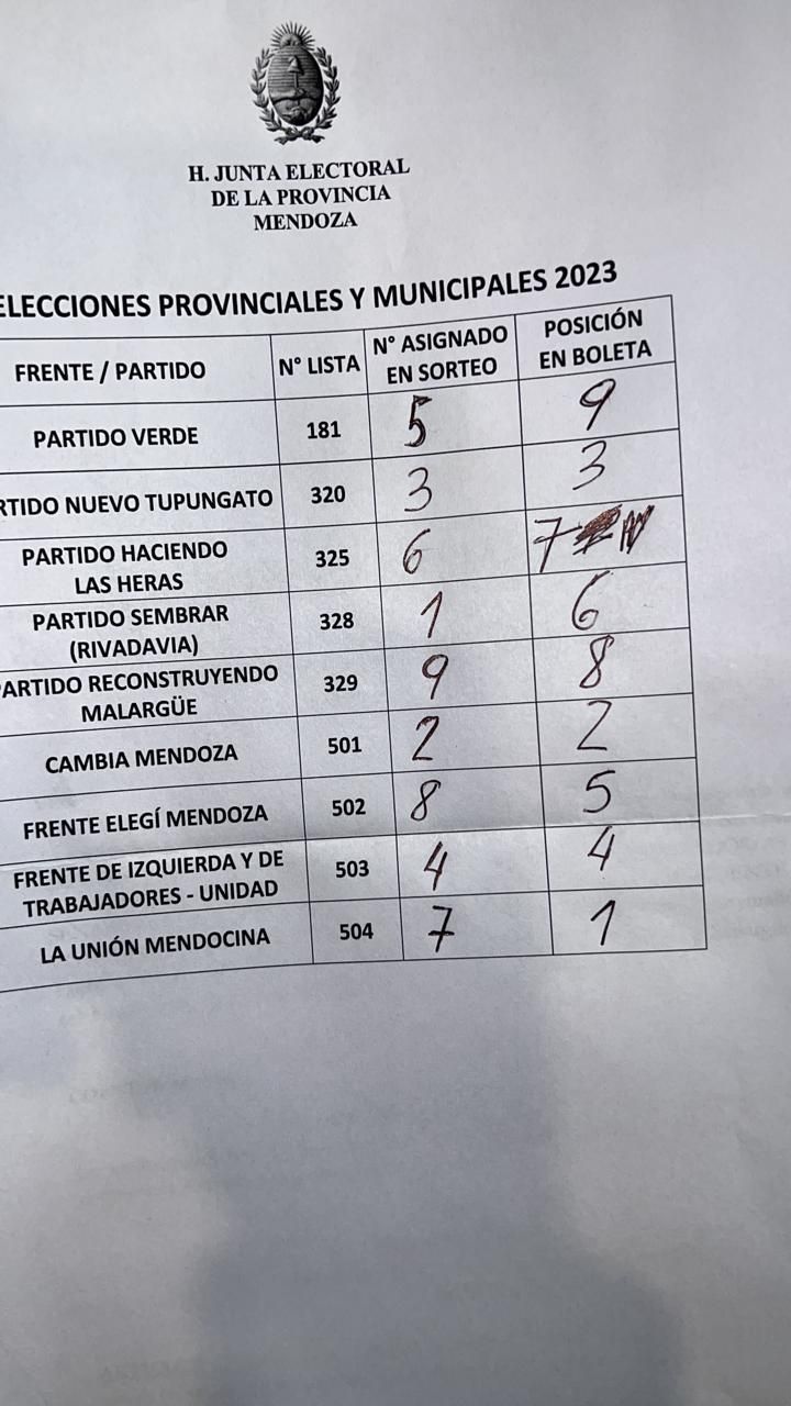 La Junta Electoral de Mendoza realizó este viernes el sorteo de la ubicación que tendrán en la boleta única los frentes y partidos políticos que competirán en las elecciones provinciales del 11 de junio. El azar le asignó el primer lugar a La Unión Mendocina, mientras que en último puesto quedó el Partido Verde.