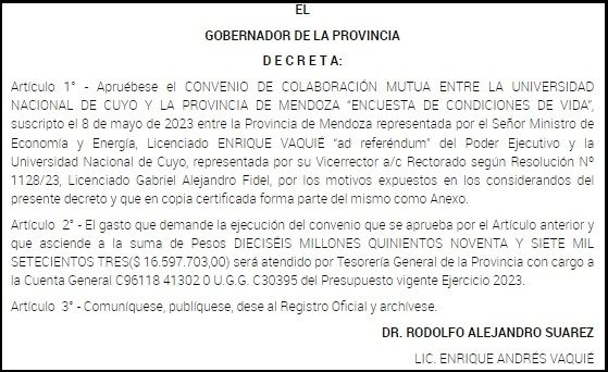 En las últimas horas se aprobó, mediante decreto, un convenio de colaboración mutua entre la Universidad Nacional de Cuyo y la provincia de Mendoza para desarrollar la encuesta “Condiciones de Vida 2023”.