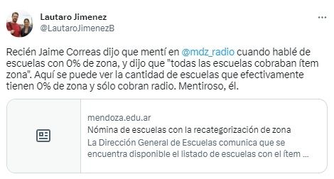 La discusión no quedó “en el aire” y Lautaro Jiménez respondió a los dichos de Correas a través de sus redes sociales: “Recién Jaime Correas dijo que mentí en MDZ Radio cuando hablé de escuelas con 0% de zona, y dijo que ‘todas las escuelas cobraban ítem zona’. Aquí se puede ver la cantidad de escuelas que efectivamente tienen 0% de zona y sólo cobran radio. Mentiroso, él”.