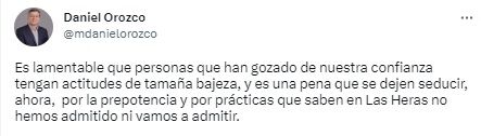 “Es lamentable que personas que han gozado de nuestra confianza tengan actitudes de tamaña bajeza, y es una pena que se dejen seducir, ahora, por la prepotencia y por prácticas que saben en Las Heras no hemos admitido ni vamos a admitir”, indicó Orozco en su cuenta e Twitter.