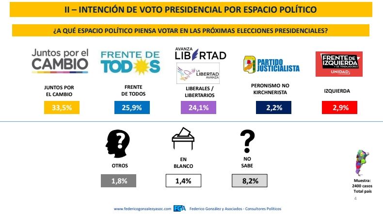Sin Cristina Fernández de Kirchner en la boleta, y de acuerdo a la encuesta de la consultora Federico González y Asociados, Juntos por el Cambio alcanza 33,5% de intención de voto frente al 25,9% del kirchnerismo y el 24,1% de la Libertad Avanza de Javier Milei.
