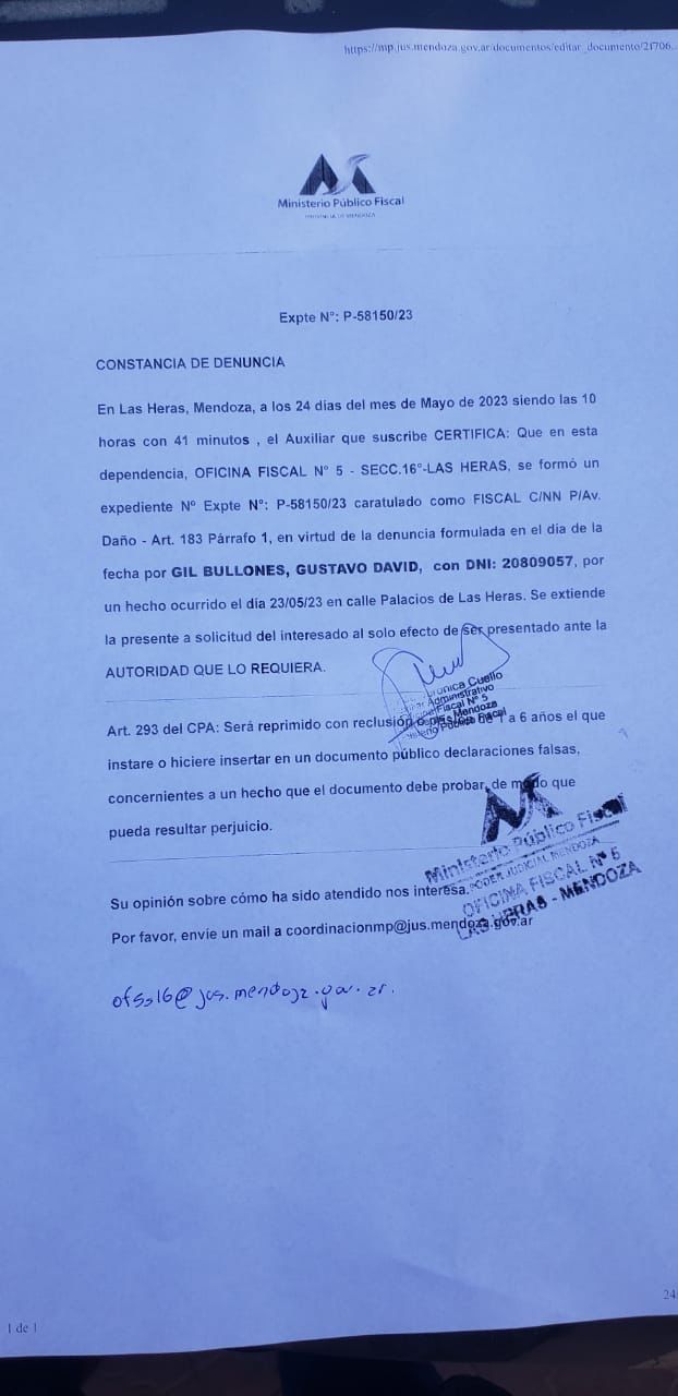 El hecho fue captado el martes por transeúntes en calle Palacios, y rápidamente viralizado a través de las redes sociales, lo que motivó a que el apoderado legal de la UCR de la provincia, Gustavo Gil, se presentara ante la Justicia para radicar la denuncia pertinente. El expediente judicial Nro P-58150/23, fue caratulado como Fiscal C/NN P/Av Daño.