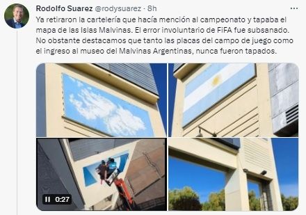 “El gobernador Suarez desinfló la pelota diciendo que era un bolazo”, acotó Carmona y siguió: “El lunes tuve algún indicio, ayer lo confirmé: habían tapado la simbología representativa del estadio, la que está desde siempre, la silueta de las Islas Malvinas y habían tapado la bandera argentina”.