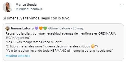 La respuesta no tardó en llegar. Marisa Uceda, diputada nacional peronista, compartió las palabras de Latorre y sumó: “Si Jimena, ya te vimos, seguí con lo tuyo”.