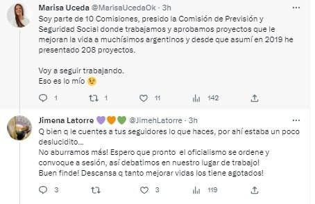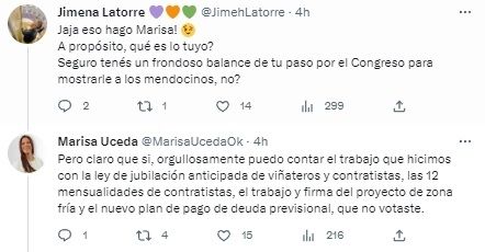 En tanto que Latorre siguió con la discusión al asegurar “jaja, eso hago Marisa. A propósito, ¿qué es lo tuyo? Seguro tenés un frondoso balance de tu paso por el Congreso para mostrarle a los mendocinos, ¿no?”