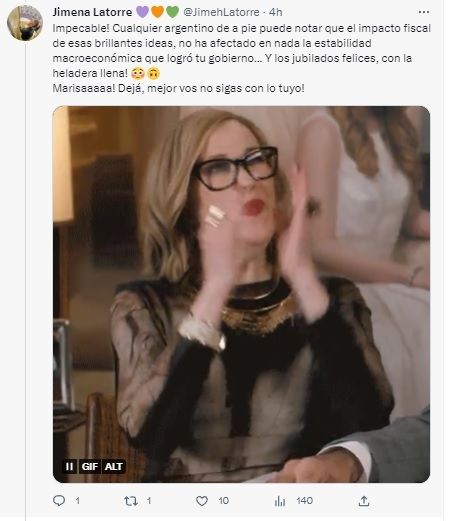 “¡Impecable! Cualquier argentino de a pie puede notar que el impacto fiscal de esas brillantes ideas, no ha afectado en nada la estabilidad macroeconómica que logró tu gobierno. Y los jubilados felices, ¡con la heladera llena!”, volvió a disparar Latorre y agregó: “Marisaaaaa, dejá ¡mejor vos no sigas con lo tuyo!”.