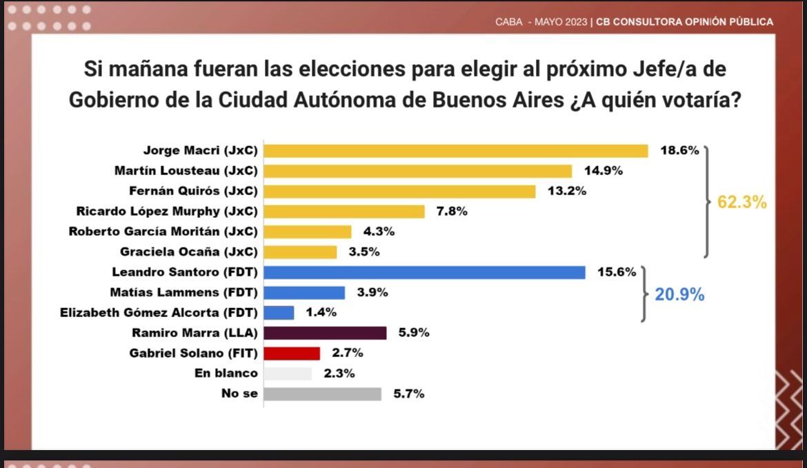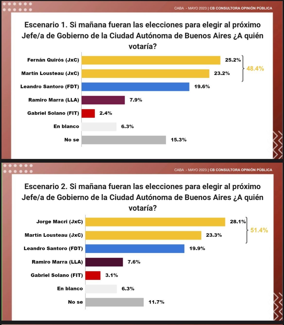 En ese contexto, la encuesta de la consultora CB le otorga a Jorge Macri una intención de voto del 18,6% en la primaria de Juntos por el Cambio seguido por Martín Lousteau con 14,9% y Fernán Quirós con 13,2%.