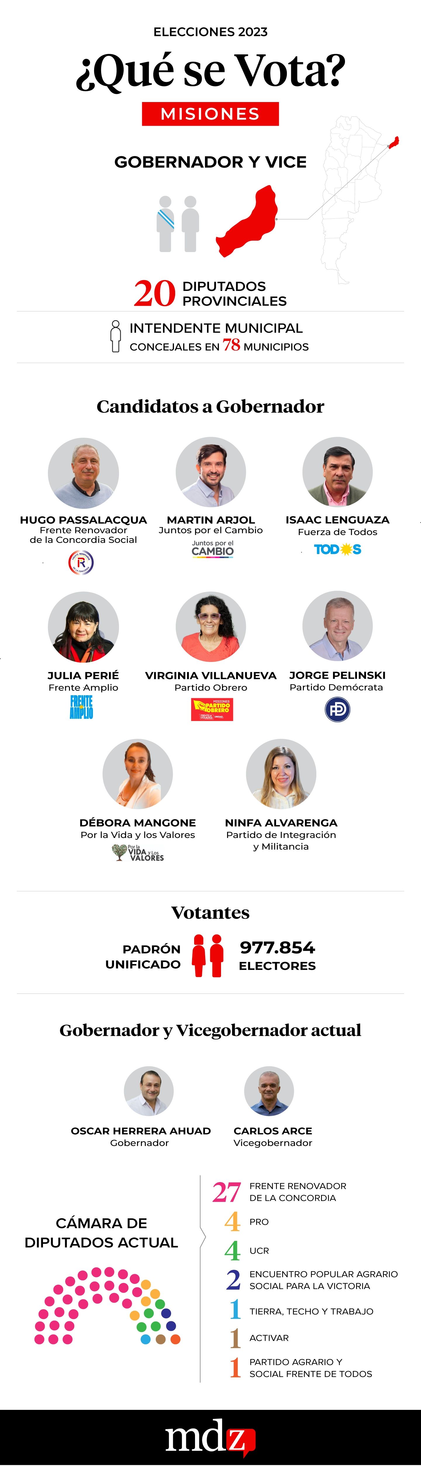 El próximo domingo 7 de mayo en Misiones se vota gobernador y vice, 20 diputados provinciales, e intendente municipal y concejales en 78 localidades. Hay 988.736 misiones habilitadas para votar en el padrón unificado (no está más dividido entre hombres y mujeres).