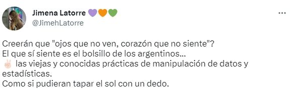 La diputada nacional Jimena Latorre también expresó su descontento: y dijo: "¿Creerán que 'ojos que no ven, corazón que no siente'? El que sí siente es el bolsillo de los argentinos... las viejas y conocidas prácticas de manipulación de datos y estadísticas. Como si pudieran tapar el sol con un dedo".