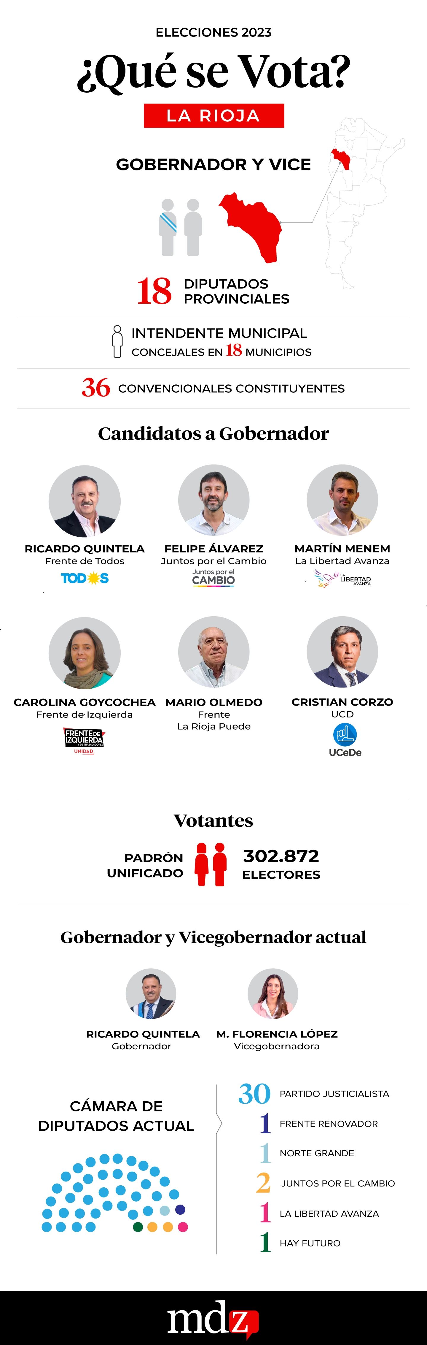 Poco más de 300.000 riojanos están en condiciones de ir este domingo a las urnas. El comicio en La Rioja tendrá como principales atractivos la elección de gobernador y de intendente de la Capital, pero también se elegirán 18 diputados provinciales (la mitad de la Legislatura riojana), todos los intendentes y concejales, además de 36 convencionales constituyentes que tendrán que reformar la Constitución provincial en los próximos 12 meses.