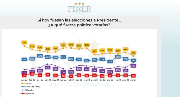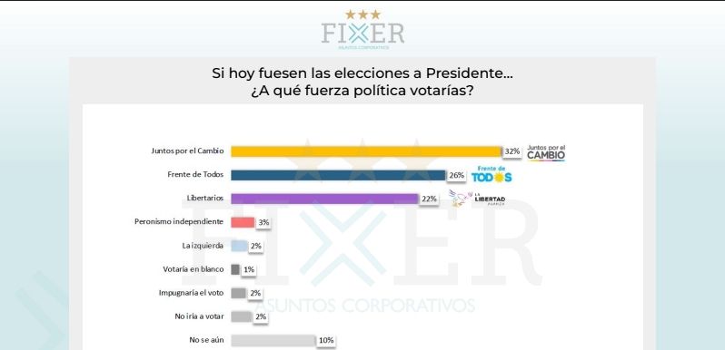 De acuerdo a la encuesta de Fixer, Juntos por el Cambio bajó de 38% en marzo a 32% en abril en intención de voto. Es la peor perfomance de los últimos 15 meses de JxC a tan sólo 3 meses de las PASO. No se puede plantear que sea tendencia, pero sí un llamado de atención frente a un oficialismo muy debilitado (volvió a caer por tercer mes consecutivo, bajando de 31% en febrero, 28% en marzo a 26% en abril).