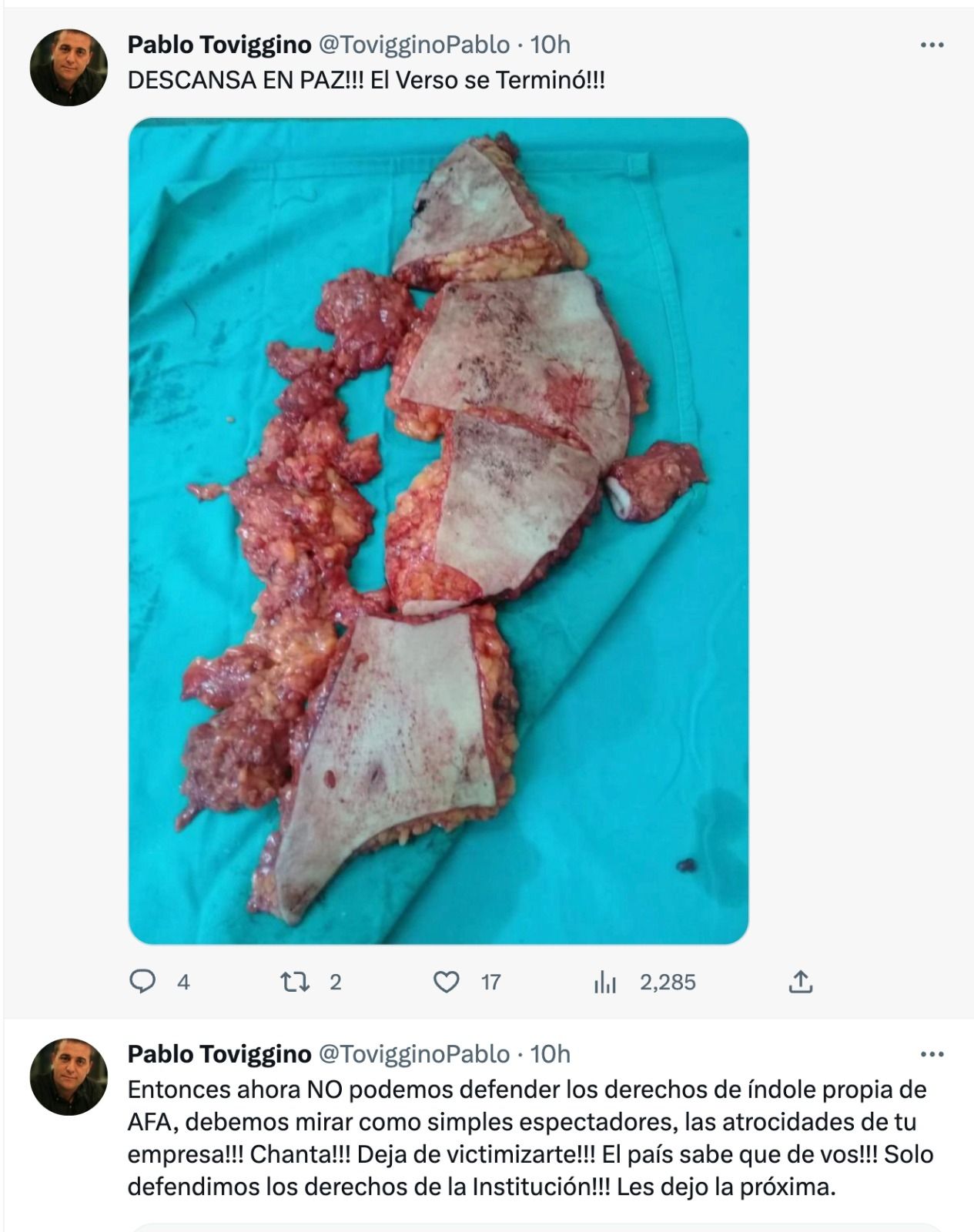 Tofoni formuló la denuncia por amenaza de muerte como consecuencia de una serie de tuits publicados por Toviggino en su cuenta personal. En uno de los mismos, según dice la denuncia, "publicó una imagen en la que se observa un trozo de carne descuartizado con el siguiente mensaje: DESCANSA EN PAZ!!! El Verso se Terminó!!!". Según Tofoni, ello "evidencia la suma gravedad de la amenaza en cuestión".