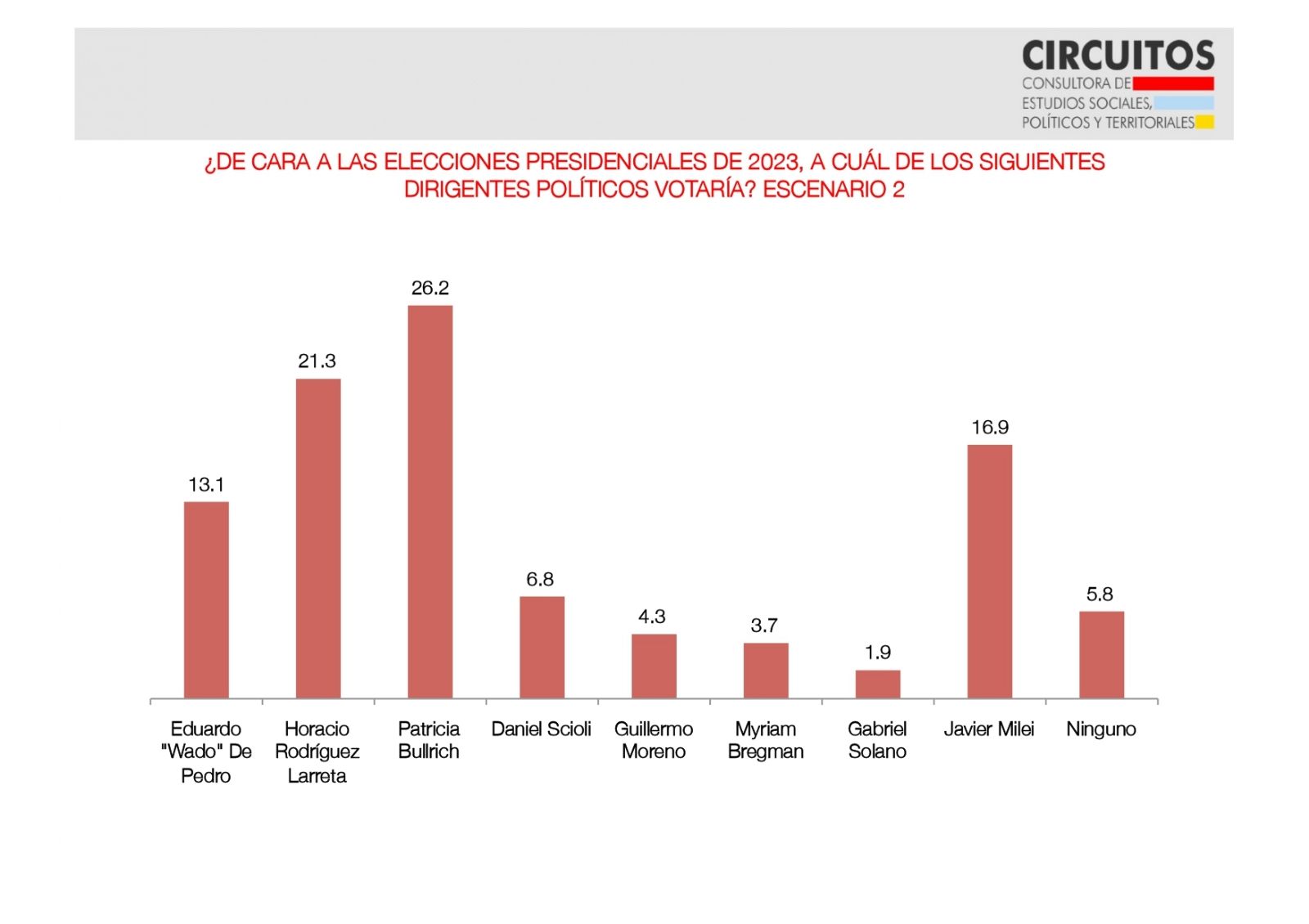 En el segundo contexto, la diferencia es mínima en torno a las posiciones y porcentajes. Sin el ministro de Economía en el escenario, sube el jefe de Gobierno porteño y se compone en el segundo lugar. Los lugares se ocupan de la siguiente forma: Bullrich (26,2%), Larreta (21,3%), Milei (16,9%), De Pedro (13,1%) y Scioli (6,8%).