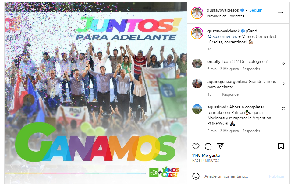 El gobernador Gustavo Valdés, que votó durante la mañana en la capital provincial, igual que los principales candidatos de las cuatro listas, a las 18 publicó en Twitter: "¡Ganó @ECOCtes + Vamos Corrientes ¡Gracias, correntinos!", en referencia a la alianza oficialista en la provincia.