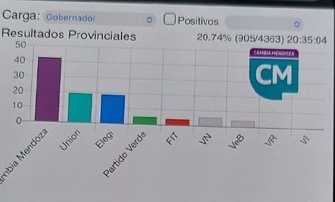 20.19. Más datos: con el 10% de las mesas escrutadas de manera extraoficial (con la aplicación de Cambia Mendoza) el frente Cambia Mendoza tiene 41% de los votos, sumando los sufragios de Cornejo y Petri. En el segundo lugar como candidato más votado está De Marchi, con 18% y el Frente Elegí suma 20% con los 4 candidatos. Pero hay un dato importante: en esa suma faltan mesas de Las Heras y Luján, donde la Unión Mendocina puede sumar más.