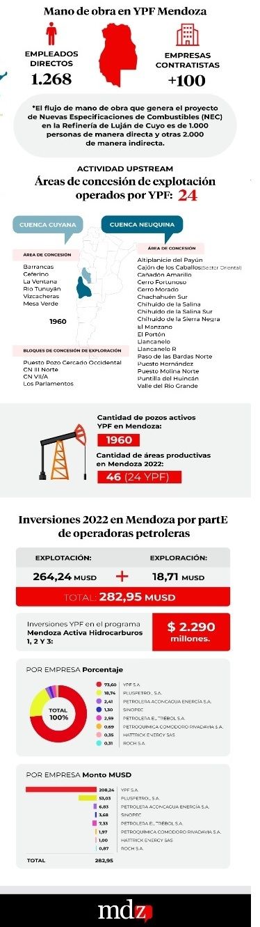 La participación mayoritaria de YPF se nota también en otra cadena de la industria, pues tiene más del 40% de las estaciones de servicio de la provincia y distribuye combustibles a otras 14 provincias. En inversión, el volumen comparativo es relevante, pues el 74% de las inversiones del programa Mendoza Activa Hidrocarburos fue por parte de la petrolera estatal. Lo mismo con los proyectos a futuro con el petróleo extra pesado de Llananelo, la recuperación terciaria de Chachahuen y el piloto en la formación Vaca Muerta, en Malargüe.