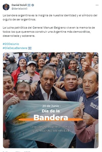 El precandidato presidencial Daniel Scioli (UxP) sostuvo que "la bandera argentina es la insignia de nuestra identidad y el símbolo del orgullo de ser argentinos". "La lucha patriótica del General Manuel Belgrano vive en la memoria de todos los que queremos construir una Argentina más democrática, desarrollada y soberana", añadió.