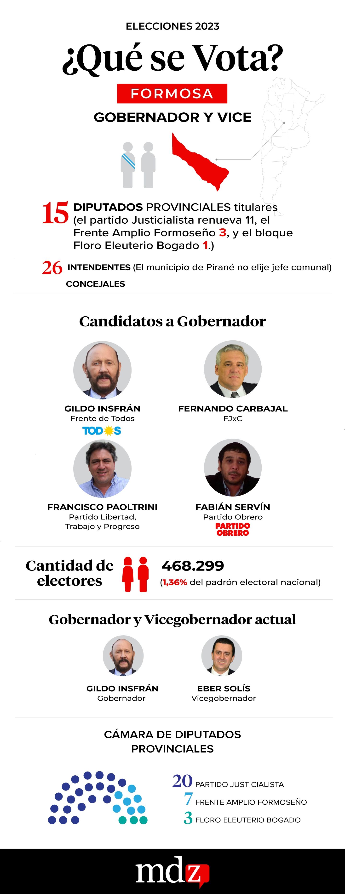 En Formosa, el 70% de la población vive del Estado provincial y/o de los planes sociales nacionales. La provincia representa el 1,36% del padrón electoral nacional, con 468.299 electores. Además de gobernador y vicegobernador, se elegirán 26 intendentes (el municipio de Pirané es el único que no elige) y concejales; y 15 diputados.