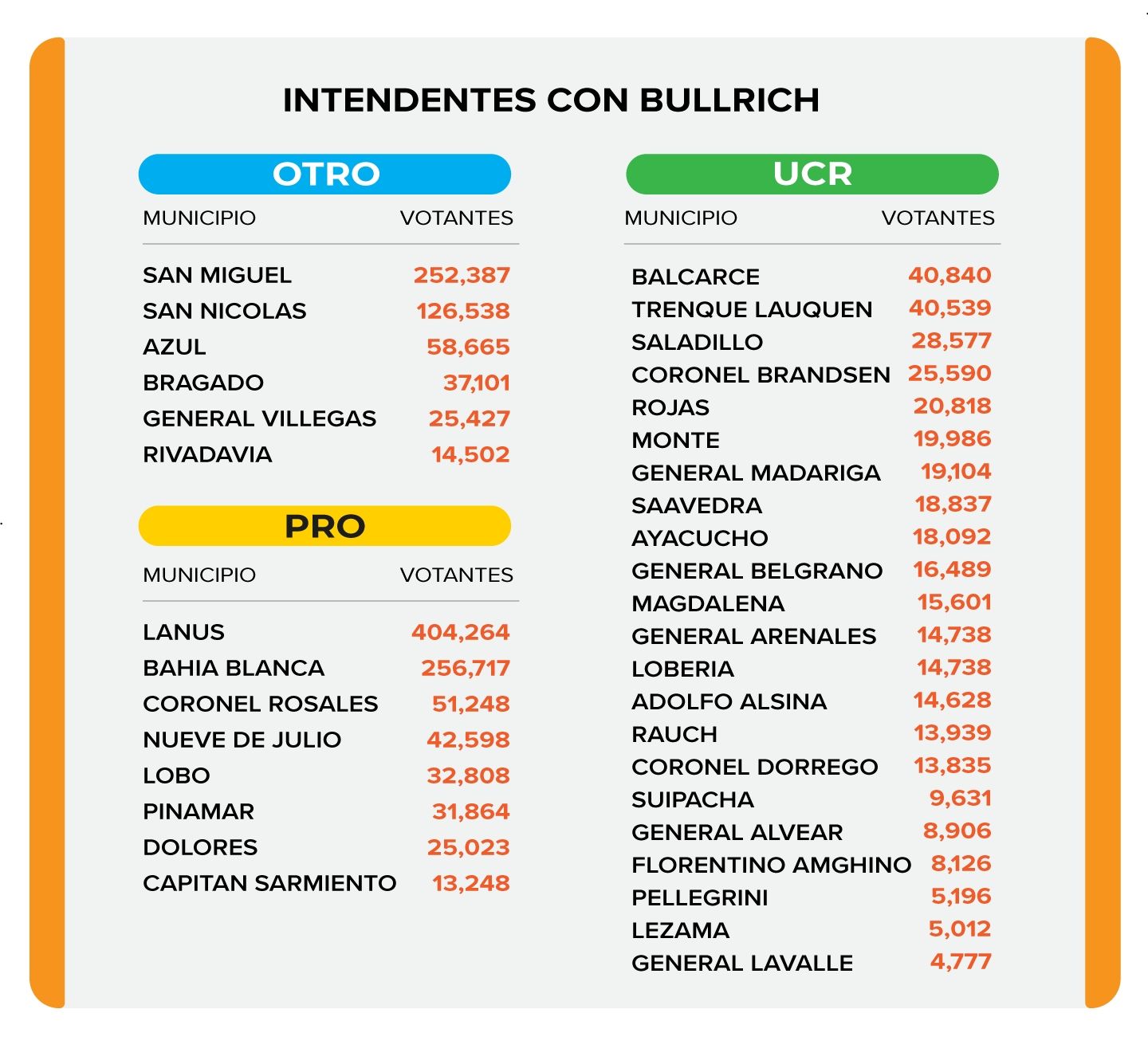 Evidentemente, la candidata presidencial logró acumular muchos más jefes comunales que su rival, sobre todo por la incorporación del jefe del radicalismo, Maximiliano Abad. Sin embargo, el jefe de Gobierno porteño termina con menos alcaldes pero con un poco más de peso demográfico que la presidenta del PRO. Concretamente, la relación de fuerzas quedó de la siguiente manera: las intendencias alineadas con Larreta suman 1.936.561 electores y las que se alinearon con Bullrich juntan 1.750.981.