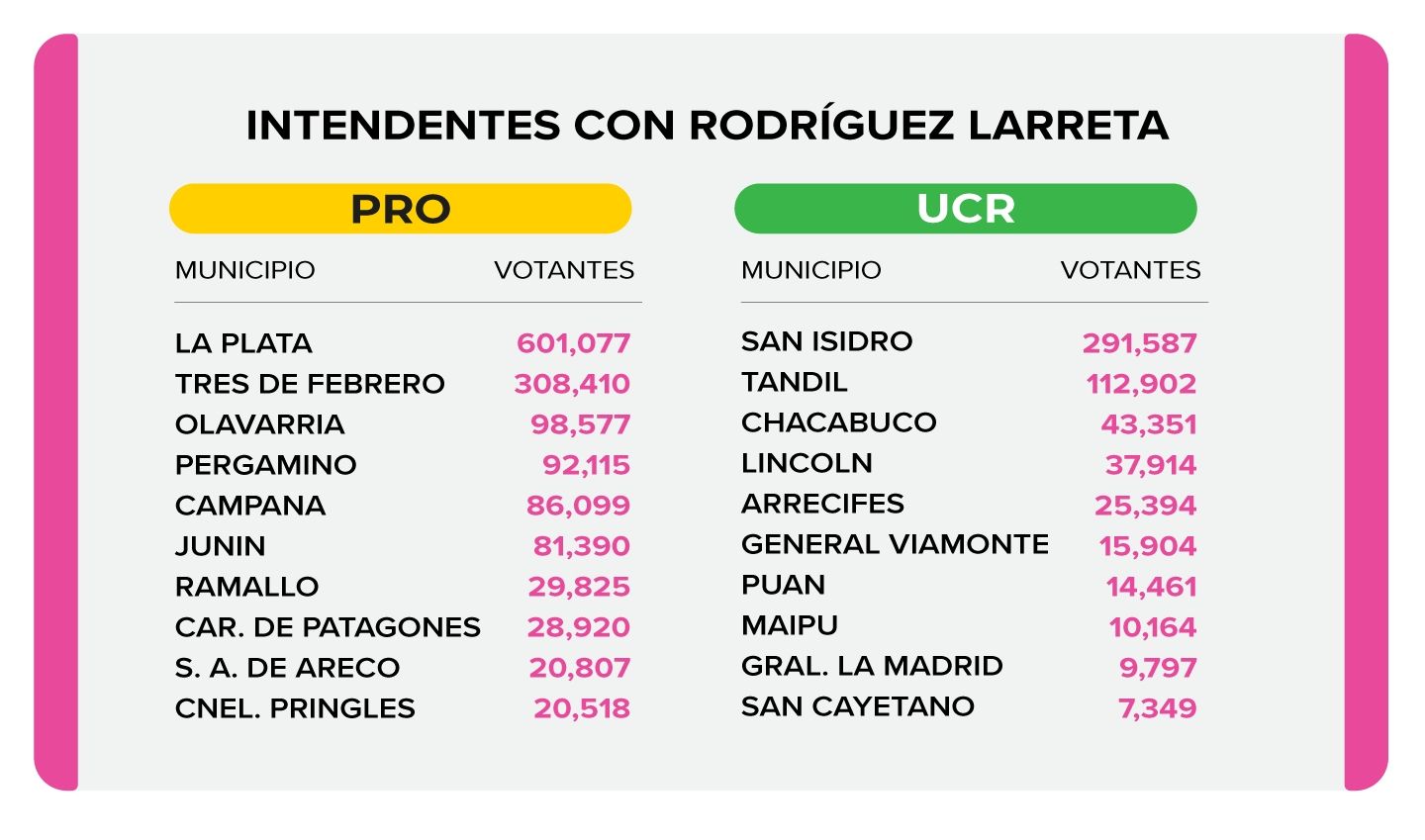 Pese a haber juntado menos alcaldes que la exministra de Seguridad, el mandatario capitalino suma más en el padrón por tener el apoyo de municipios de peso como la ciudad de La Plata, con 601.077 habilitados para votar; los 308.410 de Tres de Febrero y lo que aporta el distrito del compañero de fórmula de Diego Santilli, Gustavo Posse. El territorio de San Isidro tiene su peso con casi 300.000 votantes.