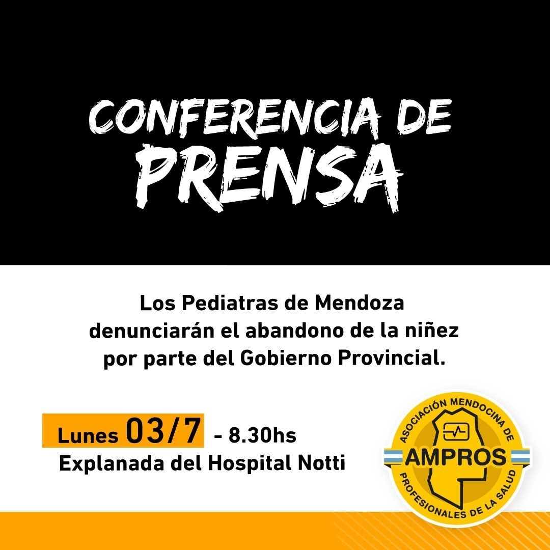 Además, desde la asociación de la salud anunciaron que el próximo lunes 3 de julio a las 8.30, los pediatras de toda la provincia denunciarán al Gobierno de Mendoza en la explanada del Hospital Notti, "por el abandono y la desprotección de niños, niñas y adolescentes".