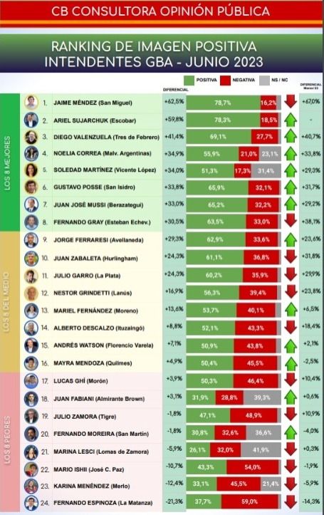 La encuesta se desarrolló durante los primeros días de junio de 2023, sobre los 24 principales municipios del GBA en más de 15.000 casos, mediante un sistema de cuestionario cerrado y de aplicación directa. Los otros dos jefes comunales que siguen al de San Miguel en el ranking son Ariel Sujarchuck, de Escobar, con 78,3% de imagen positiva, y Diego Valenzuela, de Tres de Febrero, con 69,1% de imagen positiva.
