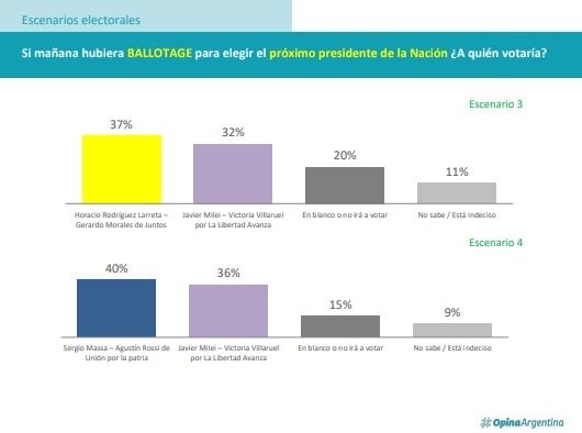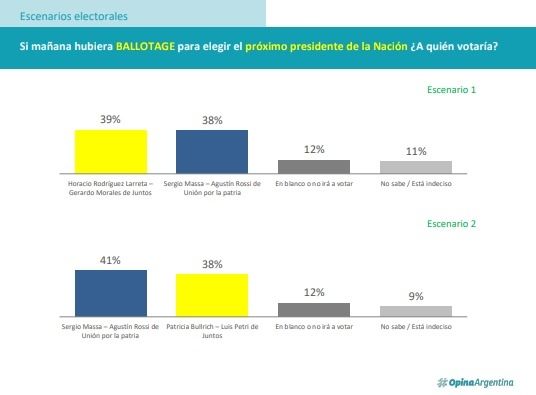 Rumbo al balotaje, Sergio Massa necesita, según Opina Argentina, que Patricia Bullrich gane la interna, dado que en caso de que enfrente al jefe de Gobierno porteño, perdería por un punto: 39 a 38. Si la final fuera contra Bullrich, ganaría 41 a 38 el ministro de Economía y un 40 a 36 contra Javier Milei a favor del titular del Palacio de Hacienda. Si fuera Larreta contra el economista, le ganaría con cinco puntos de ventaja con 37 a 32%.