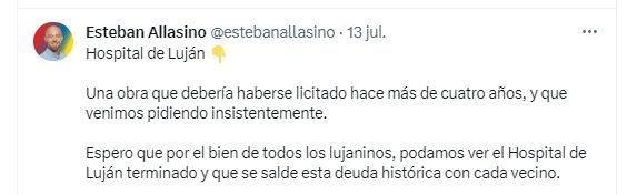 "Hace 4 años venimos insistiendo, reiterada y persistentemente, al gobierno provincial para que avance con el Hospital de Luján. Todos los gobiernos provinciales que han pasado están en deuda con nosotros, los lujaninos, sin distinción de partido. Y eso no cambiará hasta verlo terminado", manifestó en las redes el intendente de Luján. En la misma sintonía se expresó el candidato a intendente, Esteban Allasino.