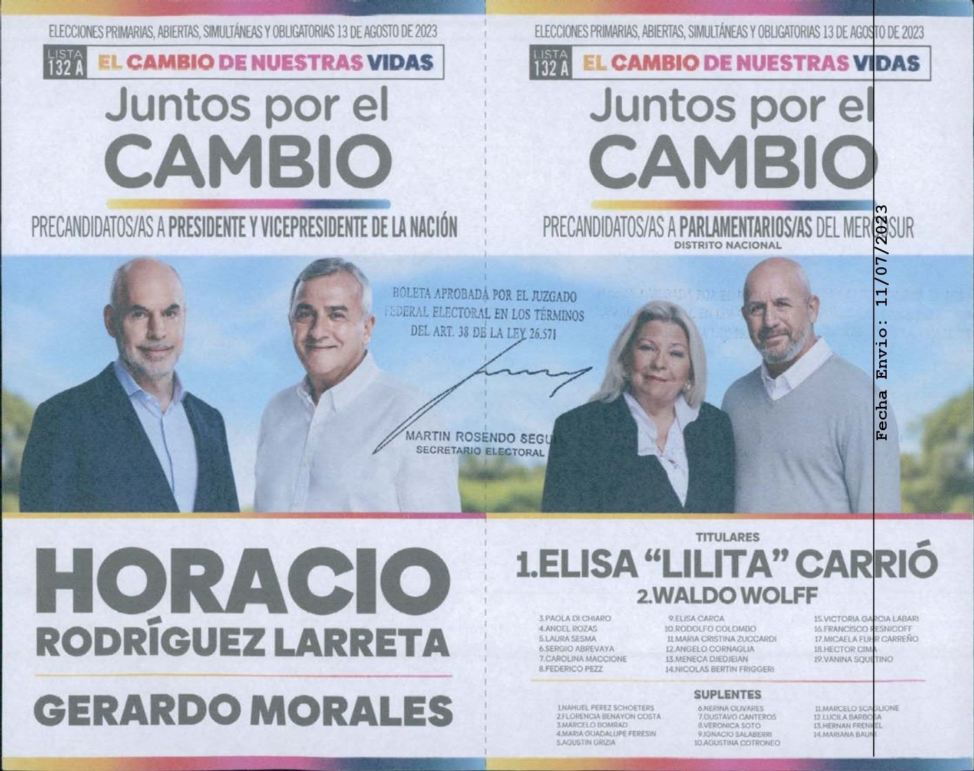 Por el lado de Juntos por el Cambio, las ofertas electorales también serán dos: la fórmula Horacio Rodríguez Larreta-Gerardo (cuya agrupación interna se llamará "El cambio de nuestras vidas") y la fórmula Patricia Bullrich-Luis Petri (bajo el nombre interno de "La Fuerza del Cambio").