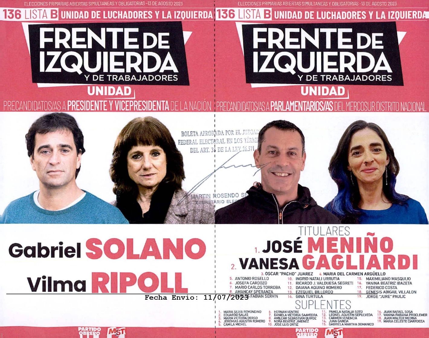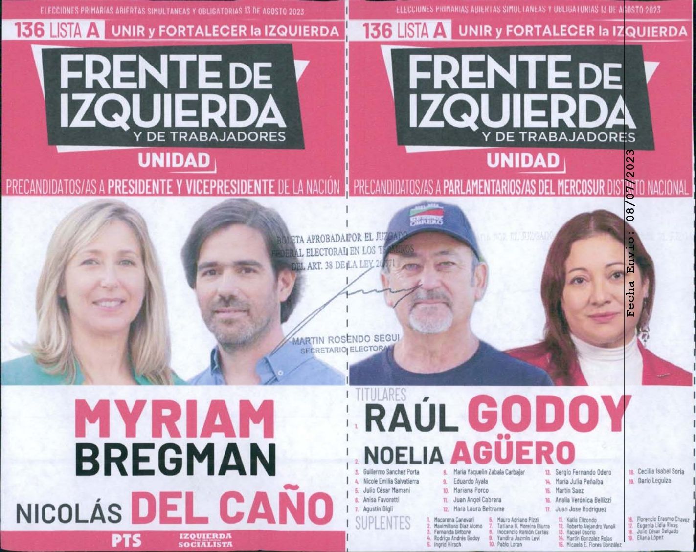 El Frente de Izquierda presentará dos fórmulas: la lista “Unir y Fortalecer la Izquierda” encabezada por Myriam Bregman y Nicolás del Caño, contra la lista “Unidad y Luchadores por la Izquierda” que impulsa a Gabriel Solano y Vilma Ripoll.