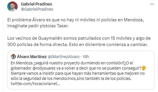Por su parte, el candidato a intendente de La Unión Mendocina, Gabriel Pradines, redobló la apuesta y cuestionó la falta de equipamiento de la fuerza policial. "El problema Álvaro es que no hay ni móviles ni policías en Mendoza, imagínate pedir pistolas Taser", aseveró el senador provincial que quiere conducir la municipalidad de Guaymallén.