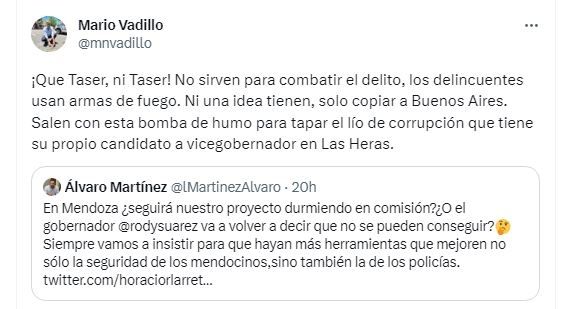Mientras tanto, el candidato a gobernador del Partido Verde, Mario Vadillo, salió al cruce de los referentes de La Unión Mendocina y aseguró que "las pistolas Taser no sirven para combatir la inseguridad". "Es increíble que La Unión Mendocina proponga darle estas armas eléctricas a los policías mendocinos en vez de dotarlos de más balas y armas de fuego", argumentó.