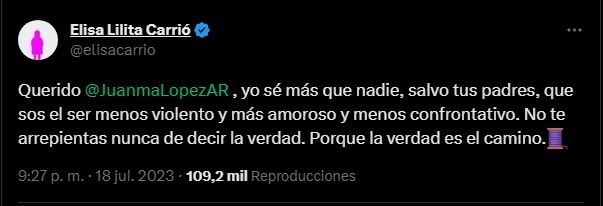 Carrió se volcó a Twitter para emitir su opinión respecto del cruce: “Querido Juan Manuel López, yo sé más que nadie, salvo tus padres, que sos el ser menos violento y más amoroso y menos confrontativo. No te arrepientas nunca de decir la verdad. Porque la verdad es el camino”.