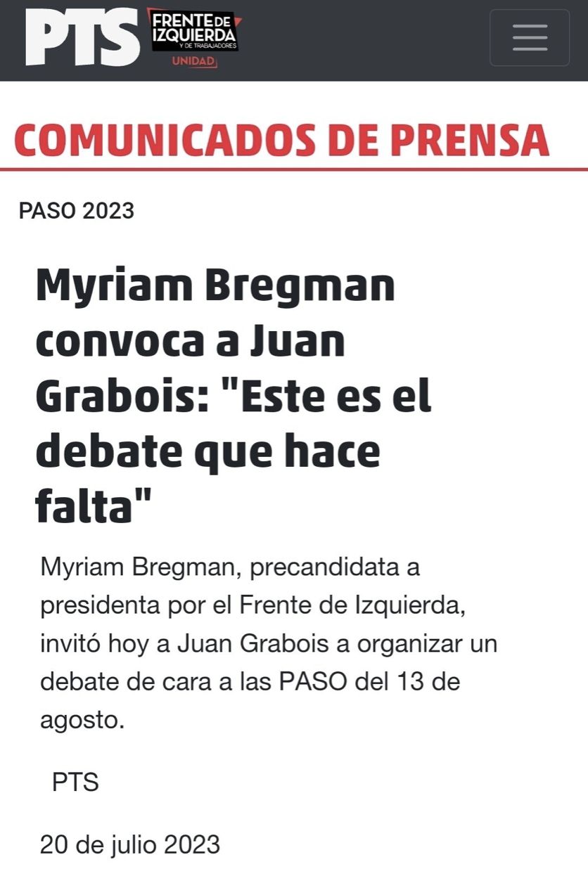 La historia no termina acá. Grabois también se sumó a la ola de querer debatir, pero no con Bregman, sino con el libertario presidenciable Javier Milei. En sus redes sociales, el dirigente del MTE escribió: " Milei ya aceptó debatir conmigo una vez, ¿se animará ahora? A esta campaña le faltan ideas, hay miedo a debatir", refiriéndose al debate moderado por Jorge Fontevecchia que tuvieron hace más de un año.