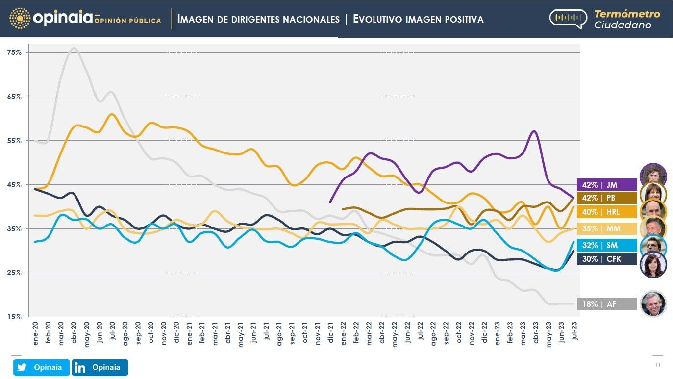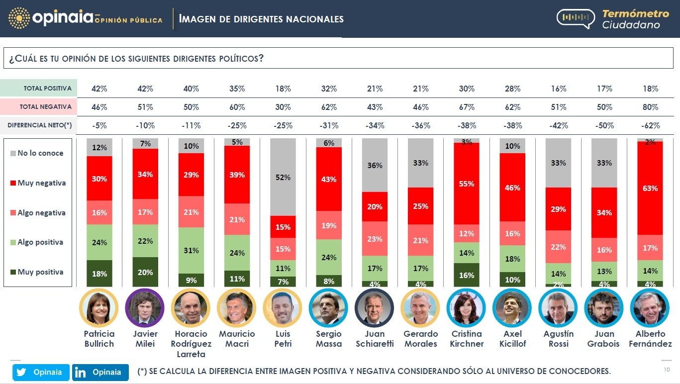 Con el dato a la baja anunciado por Sergio Massa pero con 115% interanual, la inflación es el principal problema del país para todos los votantes, por lo que seguirá siendo uno de los ejes principales de campaña. La corrupción une a los votantes de Juntos por el Cambio y de Javier Milei, mientras que al kirchnerismo es la pobreza lo que más le preocupa. Algo particular: mejoró seis puntos la imagen de Sergio Massa desde la medición anterior a pesar del contexto económico, fue tras la elección de su nombre para encarnar la boleta presidencial de Unión por la Patria.