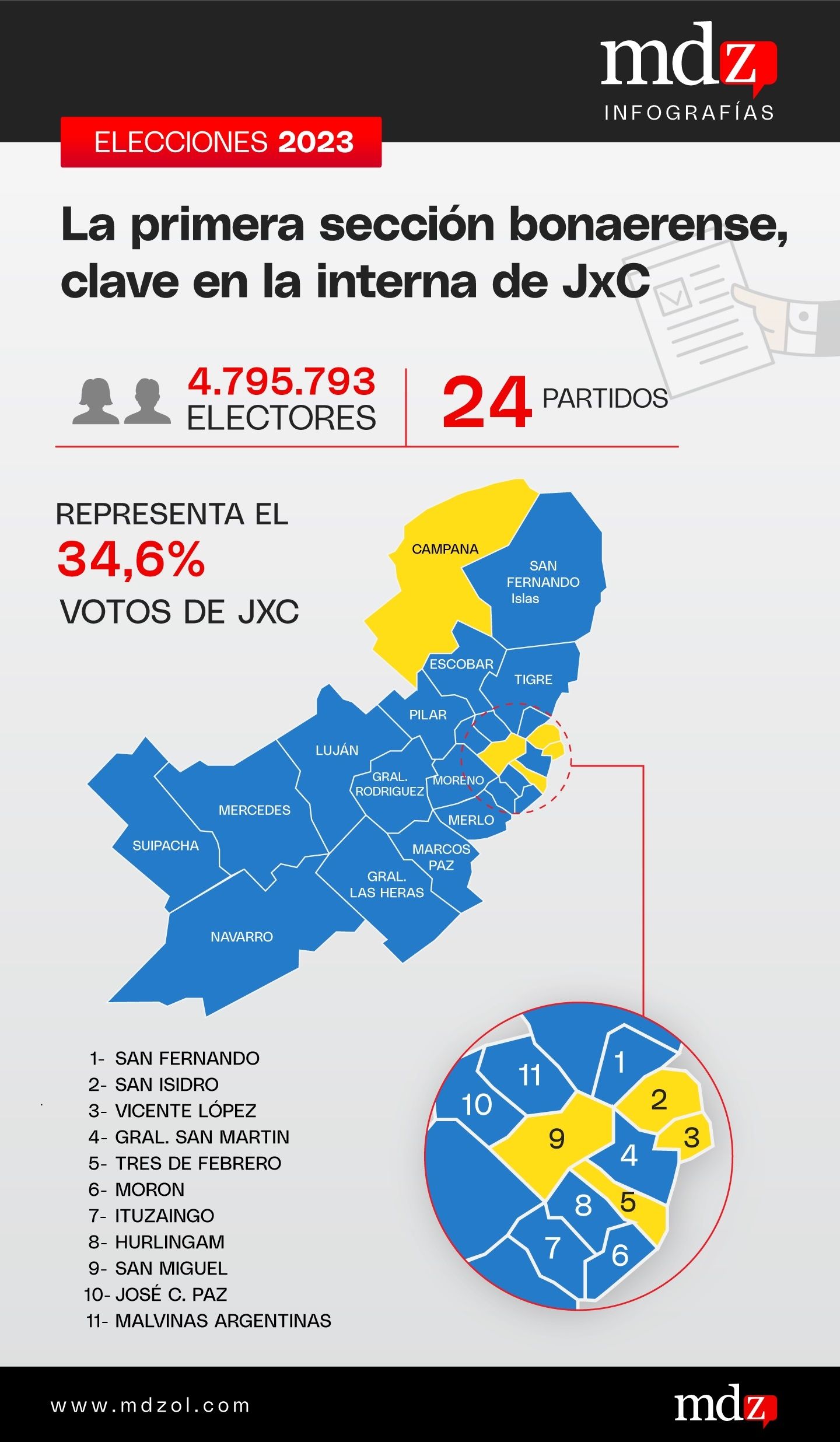 “Ella gana en el corredor norte, pero la Primera es mucho más que eso. Si te vas o te venís hacia el oeste vas a ver otra realidad y es ahí donde más lo votan a Horacio”, asegura un operador territorial del jefe de Gobierno porteño. Sin dudas, gran parte de esta contienda seccional se puede definir en los tres distritos históricamente peronistas que tienen su enclave en el segundo y tercer cordón del conurbano: Merlo, Moreno y José C. Paz. Si bien la cantidad de votos que justa JxC es baja por el predominio del PJ, lo cierto es que resultan estratégicos y es ahí donde apuesta fuerte Larreta. La obsesión es Merlo, donde manda Gustavo Menéndez que vuelve a presentarse como candidato a intendente, porque se trata del distrito más populoso de la Primera con un poco menos de 500.000 electores.
