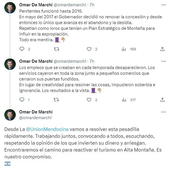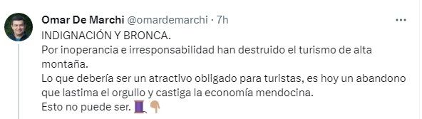 A través de una publicación en Twitter, De Marchi afirmó que “por inoperancia e irresponsabilidad han destruido el turismo de alta montaña”. “Lo que debería ser un atractivo obligado para turistas, es hoy un abandono que lastima el orgullo y castiga la economía mendocina”, indicó haciendo referencia a la situación que atraviesa el complejo de esquí que fue expropiado durante el gobierno de Cornejo y que actualmente se encuentra en licitación para una nueva concesión.