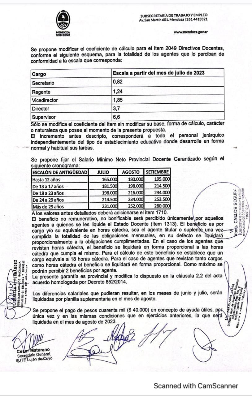 Por ahora no se han conocido “simulaciones”, es decir ejemplos concretos de sueldos para que sea más simple comprender cuánto finalmente les quedará de bolsillo a los trabajadores de la educación si suman sus diferentes ítems, como por ejemplo la zona, que es un adicional que cobran docentes que trabajan en escuelas alejadas de las áreas urbanas. Pero según los cálculos de MDZ, para profes de secundario, teniendo en cuenta la escala propuesta, alguien que tiene 36 horas y más de 24 años de antigüedad estará cerca de los 500.000 pesos en el mes de septiembre. La oferta además, incluye una especie de “bonos” que se cobrarán por única vez con el sueldo de agosto. A todo el sector docente le corresponden 40.000 pesos en concepto de “útiles”. Y a quienes son celadores, 36.000 para indumentaria y será percibido en la misma fecha. Pero además hay que sumar el ítem aula a todas las cuentas que se hagan para sacar el sueldo de bolsillo.