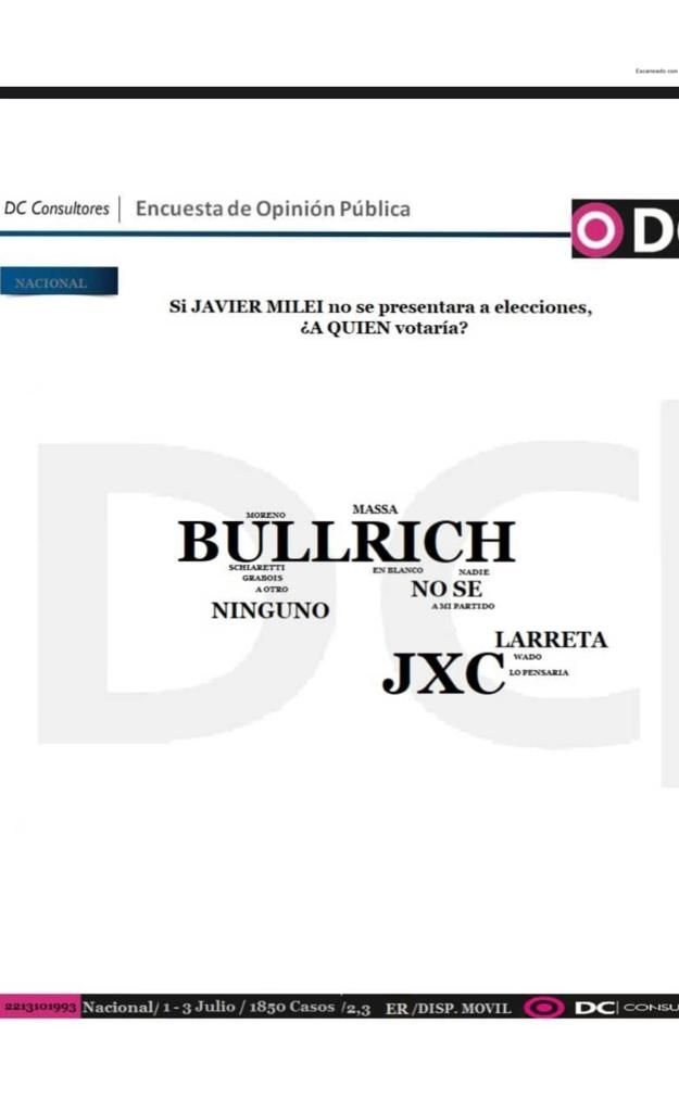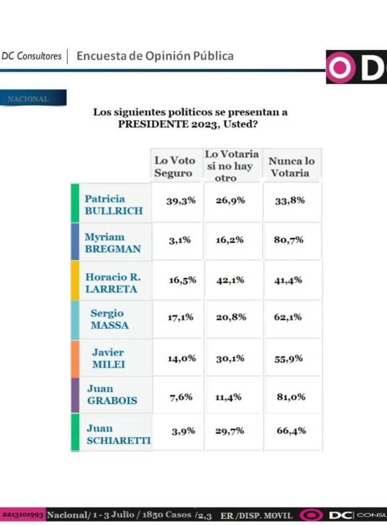 “Va a ser muy difícil para Massa, Larreta y los demás candidatos que no tengan el perfil de Bullrich dar vuelta esta situación. Quien sí tiene ese perfil es Milei, pero vemos que su voto se está diluyendo; quizás si hubiera venido de un partido tradicional con una estructura atrás estaríamos hablando de una polarización”, expresó el titular de la consultora DC.
