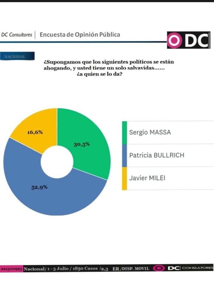 “Eso lo vemos cuando preguntamos a que político le tirarían un salvavidas. Con esa pregunta buscamos la foto, es saber que político encaja con la gente en este momento; más del 50% respondió a Bullrich. Va a ser muy difícil poder correrla de esa foto”, sintetizó el consultor.