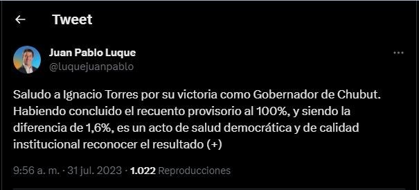 "Habiendo concluido el recuento provisorio al 100%, y siendo la diferencia de 1,6%, es un acto de salud democrática y de calidad institucional reconocer el resultado. Luego, por la diferencia de nuestro centro de cómputos, ratificaremos el resultado cuando finalice el computo definitivo. Gracias a todos los chubutenses", expresó Luque.