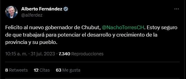 El presidente, Alberto Fernández, se sumó al candidato del peronismo derrotado en las elecciones de Chubut, Juan Pablo Luque, y reconoció el triunfo del gobernador electo de la provincia, Ignacio Torres (Juntos por el Cambio). Las congratulaciones llegaron a través de la cuenta de Twitter del mandatario, donde además agradeció al pueblo chubutense por ir a votar a pesar de las condiciones climáticas.