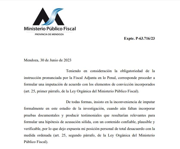 "Insisto en la inconveniencia de imputar formalmente en este estadio de la investigación, cuando aún faltan incorporar pruebas documentales y producir testimoniales que resultarían relevantes para formular una hipótesis de acusación sólida, con un contenido confiable, plausible y verificable, por lo que dejo expuesta mi posición personal de total desacuerdo con la medida ordenada", consta en el avoque enviado el 30 de junio.