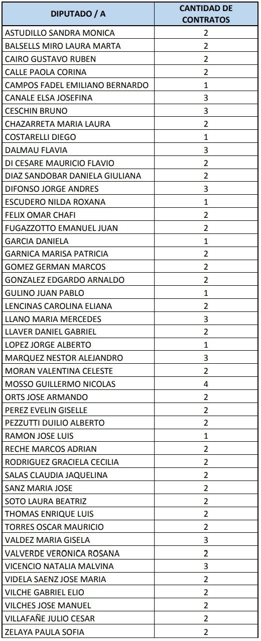 Según precisaron desde la Cámara de Diputados, hubo 31 de los integrantes del cuerpo que realizaron dos contrataciones, ocho que hicieron tres y hubo siete que solo realizaron una.