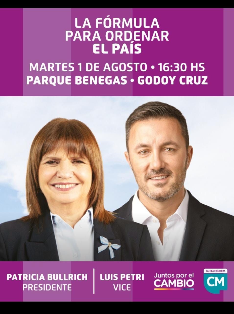 Doce días antes de las PASO (primarias abiertas, simultáneas y obligatorias) nacionales, la precandidata a presidenta de Juntos por el Cambio, Patricia Bullrich, visitará la provincia. Lo hará este martes 1 de agosto y su agenda será acotada. Arribará su avión por la tarde para dirigirse junto al precandidato a vice, el mendocino Luis Petri al Parque Benegas, en el departamento de Godoy Cruz, que gobierna el cornejismo desde hace 16 años. Alfredo Cornejo - Hebe Casado, que son la fórmula para la gobernación, se mostrarán junto a la dupla presidencial en una reunión que aglutinará a la dirigencia y a la militancia. Luego de este encuentro, además de una conferencia de prensa, se evaluará si habrá tiempo para alguna visita a un emprendedor de Guaymallén, de lo contario Bullrich, volverá a tomar un avión que la llevará a seguir recorriendo el país de cara a las primarias del domingo 13 de este mes.