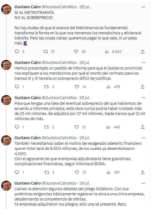 El diputado provincial Gustavo Cairo fue quien presentó el escrito, en el cual solicita que "el Gobierno de Mendoza explique por qué el monto de esta obra excede ampliamente la suma que internacionalmente se paga por kilómetro de vía de ferrocarril (1 millón de dólares aproximadamente), y supera muy holgadamente los cálculos privados sobre los costos reales de la obra". Según denuncia Cairo, los cálculos de los privados indican que el precio real de esa obra oscila los 24.640 millones de pesos. "Esto significa un sobreprecio de más de $12.250.761.161,86 mil millones de pesos", disparó el diputado de La Unión Mendocina.