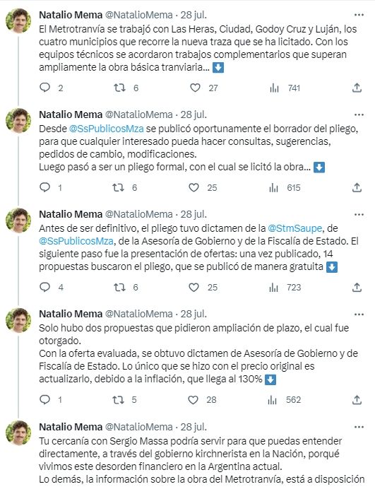 El secretario de Servicios Públicos, Natalio Mema, respondió a las acusaciones y aseveró: "Hace cuatro años se empezó a actualizar el proyecto de esta etapa del metrotranvía. Se trabajó con Las Heras, Ciudad, Godoy Cruz y Luján, los cuatro municipios que recorre la nueva traza que se ha licitado. Con los equipos técnicos se acordaron trabajos complementarios que superan ampliamente la obra básica tranviaria. Desde @SsPublicosMza se publicó oportunamente el borrador del pliego, para que cualquier interesado pueda hacer consultas, sugerencias, pedidos de cambio, modificaciones. Luego pasó a ser un pliego formal, con el cual se licitó la obra. Antes de ser definitivo, el pliego tuvo dictamen de la @StmSaupe, de @SsPublicosMza, de la Asesoría de Gobierno y de la Fiscalía de Estado".