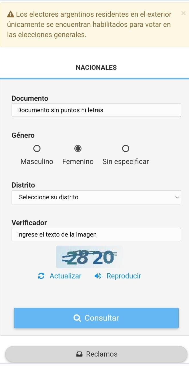 Para saber en qué escuela se vota en las PASO, - puede ser diferente a la de la elección anterior que fue provincial- hay que consultar el padrón electoral. En ese sentido, Luna respondió: “El único sitio web oficial para consultar el padrón es www.padron.gob.ar. Los datos que tenés que ingresar son únicamente el número de DNI, sexo, y provincia donde se tiene el domicilio. La consulta arrojará el establecimiento y número de mesa donde vota esa persona, número de orden en el padrón y ejemplar de DNI con el que tiene que ir a votar”.
