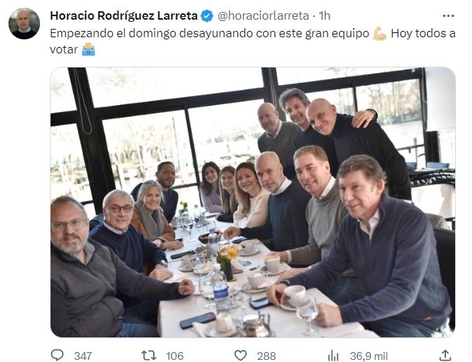 El precandidato a presidente por Juntos Por el Cambio y actual jefe de la Ciudad, Horacio Rodríguez Larreta, llegó a votar pasadas las 10 luego de haber encabezado un desayuno de su espacio con Diego Santilli y Gustavo Posse. "Todavía es muy temprano para sacar una conclusión", dijo y convocó a la gente a que vaya a votar. Aseguró, además, que hoy es un día bueno "para fortalecer la democracia" y que pase lo que pase, con los miembros de su equipo, van "a estar juntos, hoy, mañana y pasado".